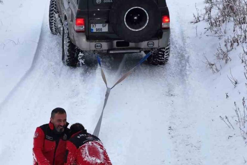 Kastamonu’da kar yağışıyla beyaza bürünen Ilgaz Dağı’na giden doğaseverler, off-road araçlarının arkasına bağladıkları lastikle kayarak eğlendi.