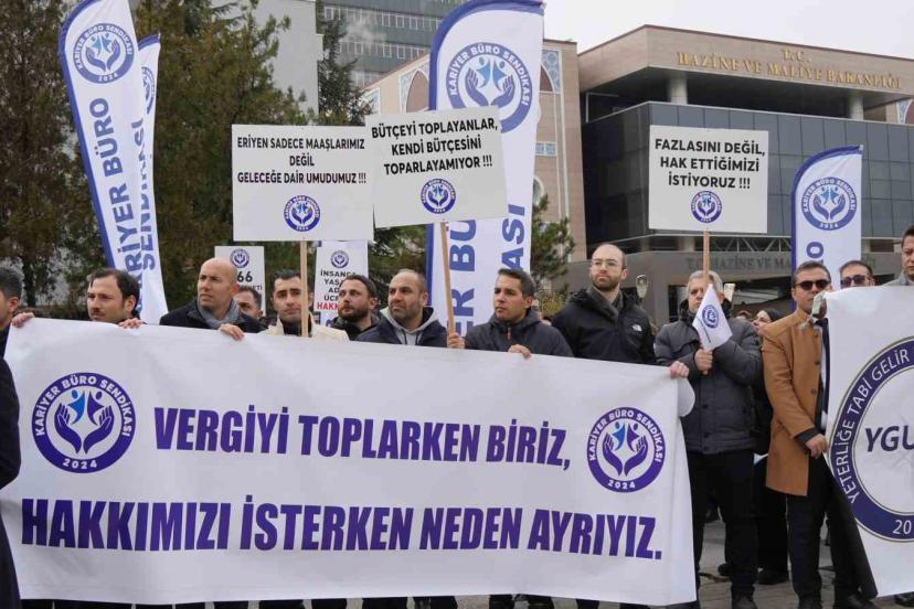 Kariyer Büro Sendikası, Ankara’da Hazine ve Maliye Bakanlığı önünde taleplerini dile getirmek amacıyla eylem düzenledi. Farklı illerden gelen sendika üyelerinin katılımıyla yapılan açıklamada; sendikanın temsil ettiği gelir uzmanları, muhasebe uzmanları, SGK denetmenleri, il göç uzmanları, muhasebe denetmenleri, milli emlak uzmanları, ticaret denetmenleri, mali hizmetler uzmanları, vergi istihbarat uzmanları başta olmak üzere kariyer meslek mensuplarının özlük hakları ile seyyanen zam talepleri gündeme taşındı.
