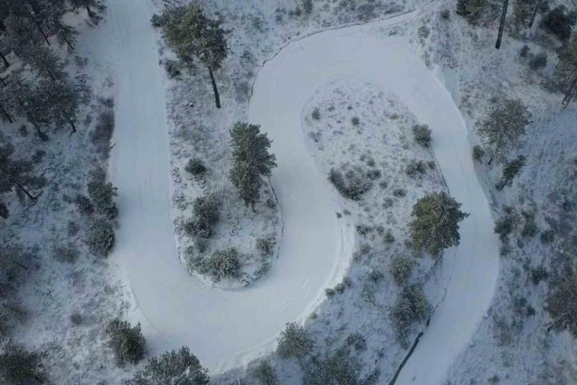 Drone ile kaydedilen görüntülerde, karla kaplanan dağ silsileleri, ormanlık alanlar ve kıvrılarak uzanan yollar görsel bir şölen sundu.