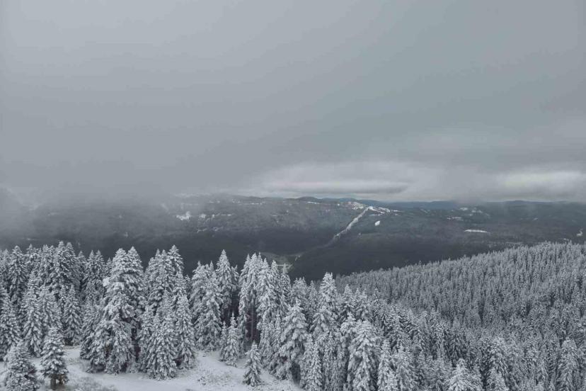 Kar yağışıyla beyaza bürünen Ilgaz Dağı, havadan görüntülendi.