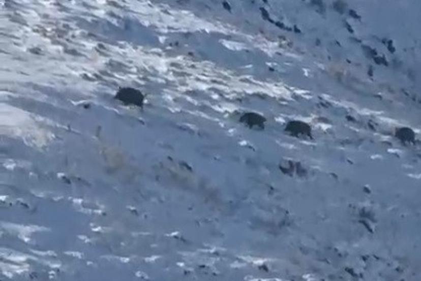 Kars’ın Akyaka ilçesine bağlı Küçükdurduran ve Sulakbahçe köylerinde sabah erken saatlerde ortaya çıkan domuz sürülerinin, koşarak karlı arazide ilerlediği görüldü. Domuz sürüleri Tokay Kurtbaş ve Mahsuncan Işık, tarafından cep telefonu kameralarıyla kaydedildi. Görüntülerde, kalabalık domuz sürüsünün karla arazilerde ve dağlık bölgede hızla kaçtığı anlar yer aldı.