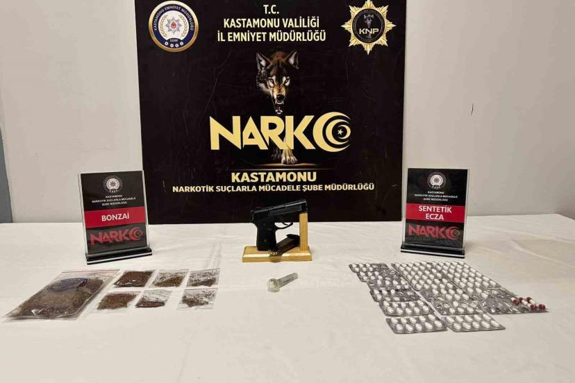 Edinilen bilgiye göre, Kastamonu İl Emniyet Müdürlüğü Narkotik Suçlarla Mücadele Şube Müdürlüğü ekiplerince, uyuşturucu madde kullanan ve satan şahıslara yönelik operasyon düzenlendi. Operasyonda yapılan aramada 46,41 gram bonzai maddesi, 125 adet sentetik ecza hapı, 1 adet uyuşturucu kullanımında kullanılan cam düzenek, 1 adet 7,65 mm çapında ruhsatsız tabanca ve tabancaya ait 1 adet şarjör ile 2 adet 7,65 mm çapında fişek ele geçirildi.
