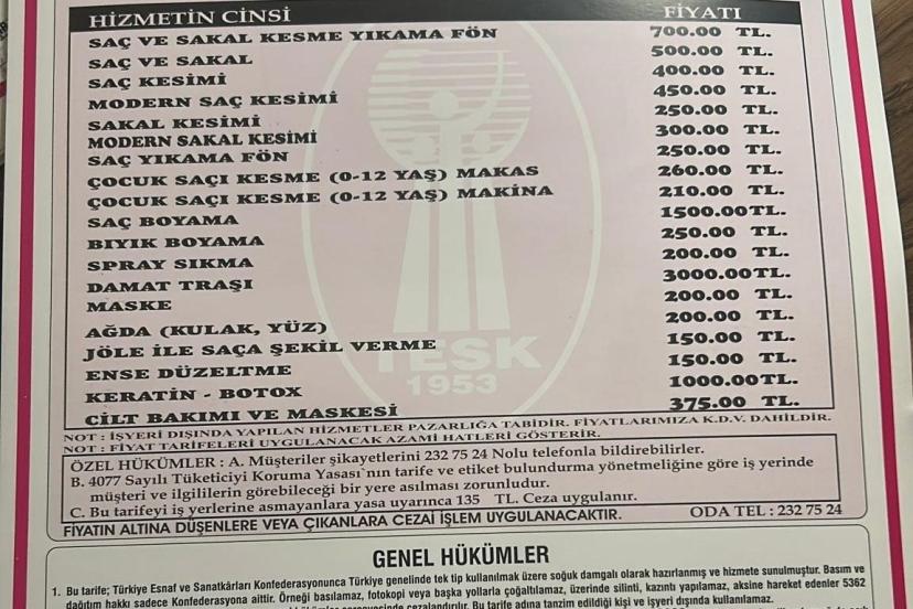 Açıklanan fiyat listesine göre; saç ve sakal yıkama fön 700 TL, saç ve sakal 500 TL, saç kesimi 400 TL, modern saç kesimi 450 TL, sakal kesimi 250 TL, modern sakal kesimi 300 TL, saç yıkama fön 250 TL, çocuk saçı kesme (0-12 yaş) makas 260 TL, çocuk saçı kesme (0-12 yaş) makine 210 TL, saç boyama bin 500 TL, bıyık boyama 250 TL, sprey sıkma 200 TL, damat tıraşı 3 bin TL, maske 200 TL, ağda (kulak, yüz) 200 TL, jöle ile saça şekil verme 150 TL, ense düzeltme 150 TL, keratin-botox bin TL ve cilt bakımı ve maskesi de 375 TL oldu.