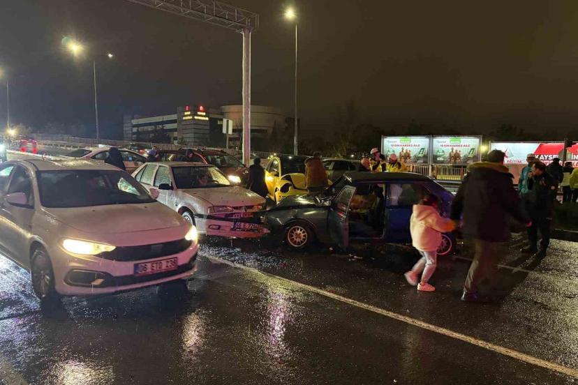 Kayseri’nin Kocasinan ilçesinde kontrolden çıkan otomobil, yolun karşısına geçerek kırmızı ışıkta bekleyen 5 araca çarptı.
