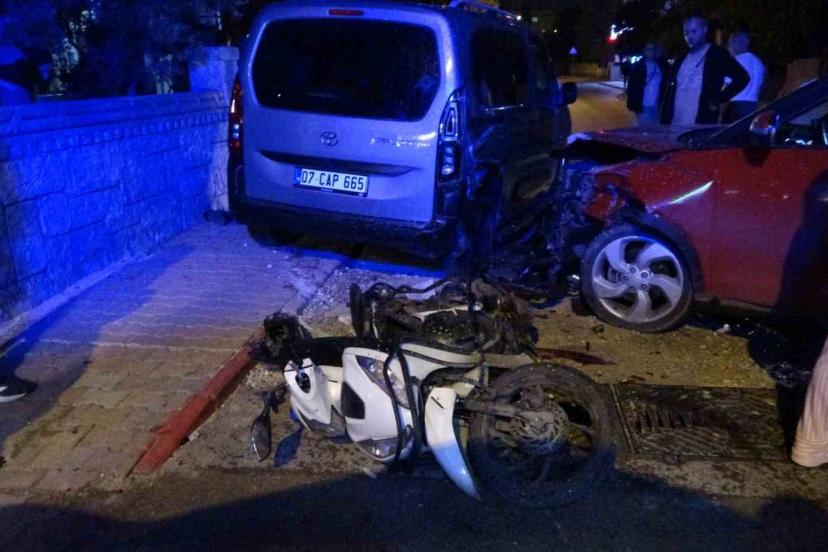Kaza, dün akşam saat 22.00 sıralarında Muratpaşa ilçesi Yenigün Mahallesi 1057. Sokak ile 1060. Sokak kesişiminde meydana geldi. Edinilen bilgiye göre, Gülsüm Y.’nin kullandığı 07 GYG66 plakalı otomobil, sokak kesişiminde çalıştığı iş yerine gelen siparişi teslim etmek üzere yola çıkan Yahya Ç.’nin kullandığı 07 AYR 106 plakalı motosiklete çarptı. Kaza nedeniyle panikleyen Gülsüm Y.’nin kullandığı araç, önüne aldığı motosikletle birlikte park halindeki 07 CAP 665 plakalı otomobile büyük bir gürültüyle çarptı. Gürültü üzerine sokağa çıkan mahalle sakinleri, iki araç arasında sıkışan motosiklet sürücüsü Yahya Ç.’yi bulunduğu yerden çıkartarak kaldırıma aldı. Kazanın 112 Acil Çağrı Merkezi’ne bildirilmesi üzerine olay yerine polis ve sağlık ekipleri sevk edildi. Bölgeye gelen sağlık ekiplerinin kaldırımda ilk müdahaleyi yaptığı Yahya Ç.’nin bacağında kırıklar olduğu belirlenirken, acı içindeki feryatları ise mahalleyi inletti. Yaralı motosiklet sürücüsü ambulansla hastaneye kaldırıldı.