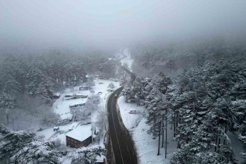 Marmara ile Ege Bölgesi’ni fiziki olarak ayıran Kazdağları’nda etkili olan kar yağışı sonrası ortaya çıkan beyaz şölen havadan görüntülendi.