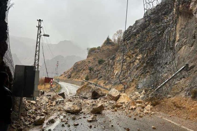 Erzincan’ın Kemaliye ilçesinde Şırzı Köprüsü’ne giden yolda bulunan tünelin girişindeki tel örgü sisteminin çökmesi, sürücüle...