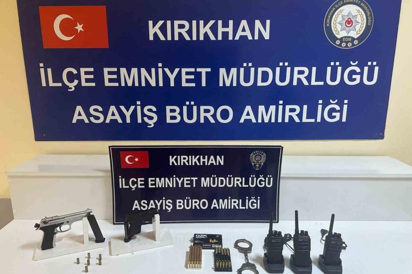 Hatay’ın Kırıkhan ilçesinde şüpheli hareketlerde bulunan 2 şahsın yapılan üst aramasında ruhsatsız silah, mermi ve el telsizleri ele geçirildi.