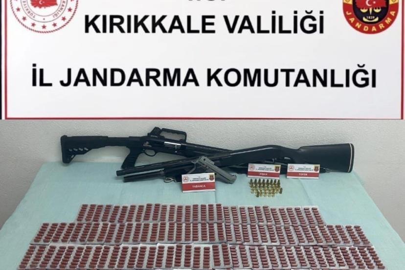 Kırıkkale Cumhuriyet Başsavcılığı talimatıyla İl Jandarma Komutanlığı ekiplerince yürütülen çalışmalar kapsamında N.Ü. (31) isimli şahsın uyuşturucu madde ticareti yaptığı bilgisine ulaşıldı. Şüphelinin merkez ilçedeki evine operasyon düzenlendi. Jandarma ekiplerince yapılan aramada bin adet sentetik ecza, 2 av tüfeği, 1 tabanca ve 34 adet mühimmat ele geçirildi.
