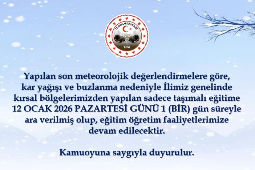 Kırklareli Valiliği tarafından yapılan son meteorolojik değerlendirmelere göre, il genelinde etkili olması beklenen kar yağışı ve buzlanma sebebiyle ulaşımda aksamalara yol açabileceği değerlendirilerek, kırsal bölgelerden yapılan taşımalı eğitime 12 Ocak 2026 Pazartesi günü 1 gün süreyle ara verildi.