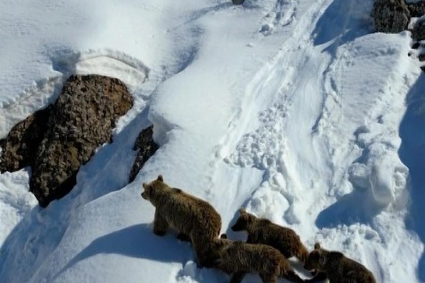 Bingöl’de kış uykusundan uyanarak karla kaplı arazide dolaşan ayı ve üç yavrusu dron ile görüntülendi.