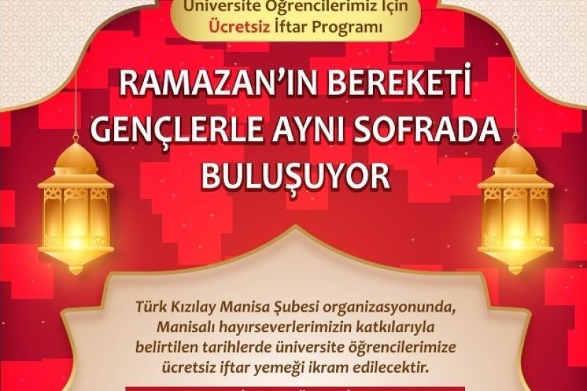 Türk Kızılay Manisa Şubesi tarafından, Manisalı hayırseverlerin katkılarıyla üniversite öğrencilerine yönelik ücretsiz iftar programı düzenleniyor. Ramazan ayının paylaşma ve dayanışma ruhunu yaşatmayı amaçlayan organizasyon kapsamında, belirlenen tarihlerde öğrencilere 16 gün ücretsiz iftar yemeği ikram edilecek.