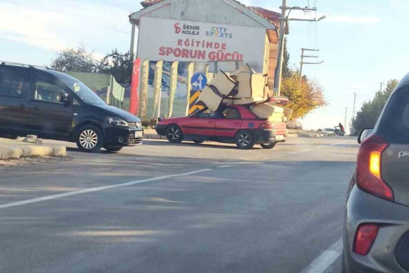 Eskişehir’de otomobilin üzerine koltuk takımı yükleyen sürücü trafikte tehlikeye neden oldu.