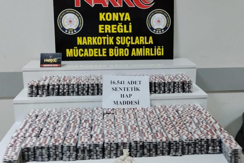 Konya’nın Ereğli ilçesinde polis ekiplerinin düzenlediği uyuşturucu operasyonunda 16 bin 541 adet sentetik ecza ele geçirildi, 3 kişi tutuklandı.