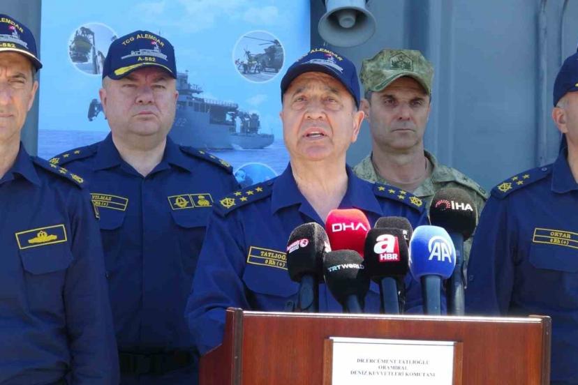 Türkiye Cumhuriyeti Deniz Kuvvetleri Komutanı Oramiral Ercüment Tatlıoğlu Aksaz açıklarında 15-21 Nisan 2026 tarihleri arasında icra edilen Kurtaran-2026 Denizaltı Arama Kurtarma Davet Tatbikatı kapsamında TCG Alemdar gemisinde basın mensuplarına açıklamalarda bulundu.