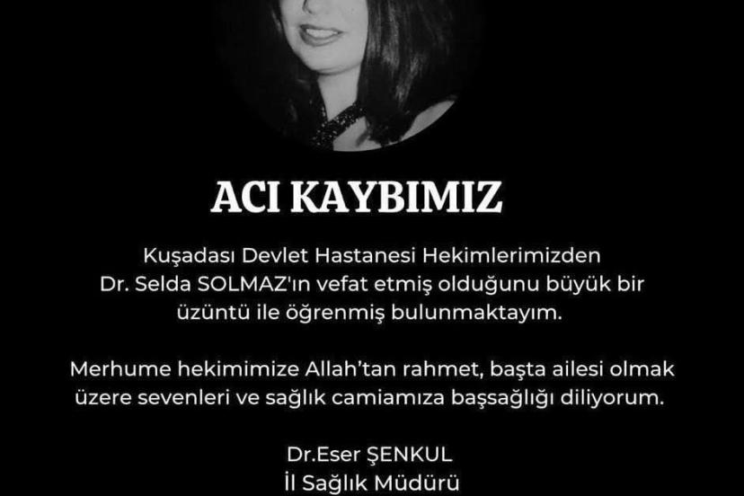 Kuşadası Devlet Hastanesi’nde görevli Dr. Selda Solmaz bir süre önce amansız hastalığa yakalandı. Meslektaşları tarafından tedavi altına alınan Solmaz, tüm çabalara rağmen kurtarılamadı. Solmaz’ın ölüm haberi sevenleri, meslektaşları ve hastaları arasında derin bir üzüntüye yol açtı. Sağlık camiasını yasa boğan acı haberin ardından Aydın İl Sağlık Müdürü Dr. Eser Şenkul da taziye mesajı yayımladı. Şenkul mesajında, "Kuşadası Devlet Hastanesi hekimlerimizden Dr. Selda Solmaz’ın vefat etmiş olduğunu büyük bir üzüntüyle öğrenmiş bulunmaktayım. Merhume hekimimize Allah’tan rahmet, başta ailesi olmak üzere sevenleri ve sağlık camiamıza başsağlığı diliyorum" ifadelerine yer verdi.