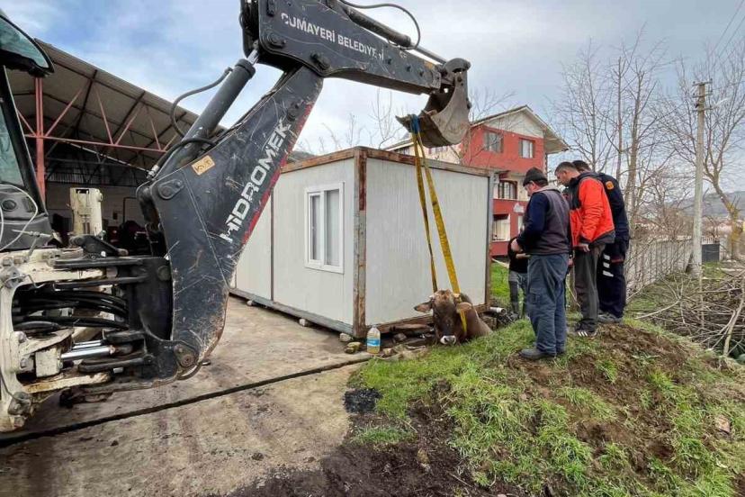 Düzce’de kuyuya düşen inek Cumayeri Belediyesi ekiplerince yapılan çalışmanın ardından bulunduğu yerden kurtarıldı.