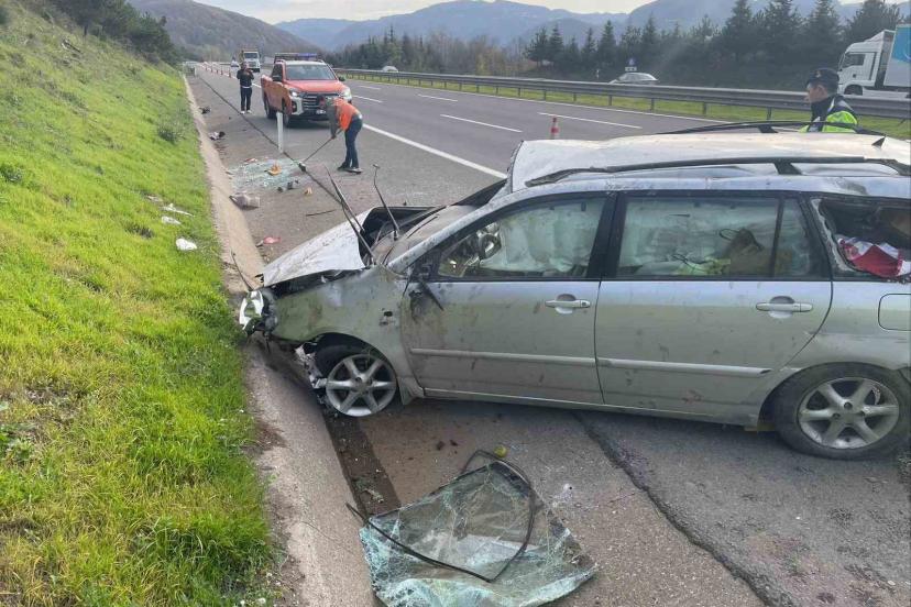 DÜZCE(İHA) – Anadolu Otoyolu Düzce geçişinde lastiği patlayan otomobil bariyere çarparak takla attı.
