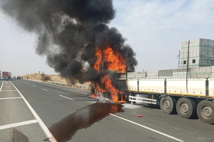 Malatya-Elazığ Karayolu Kale ilçesi mevkiinde inşaat malzemesi yüklü bir tırda çıkan yangın, itfaiye ekiplerince söndürüldü.