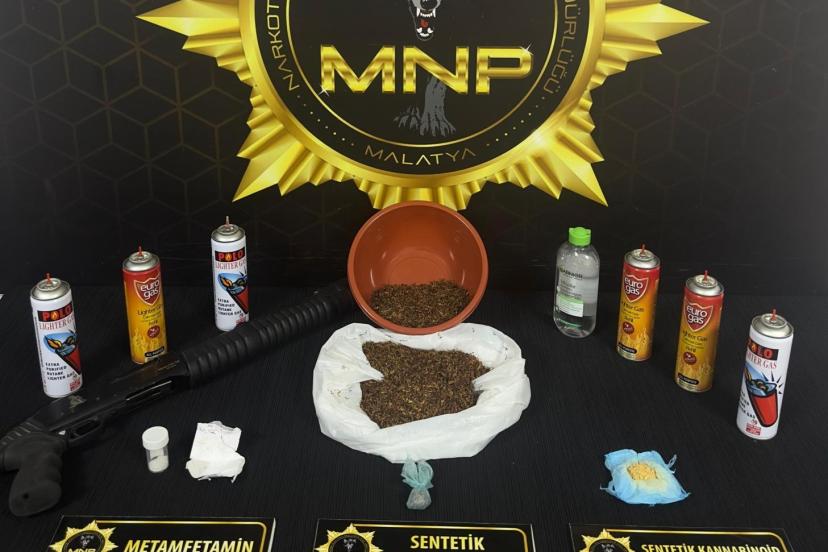 Malatya’da, Narkotik Suçlarla Mücadele Şube Müdürlüğü ekiplerince "torbacı" olarak tabir edilen sokak satıcılarına yönelik fiziki takipli çalışmalar sonucunda belirlenen 7 şüphelinin üzerlerinde ve ikametlerinde arama yapıldı. Yapılan aramalarda 623 gram sentetik kannabinoid, 156 adet sentetik ecza hap, 7 gram A-M sentetik kannabinoid hammaddesi, 25 gram metamfetamin maddesi ve 1 adet ruhsatsız tüfek ele geçirildi.