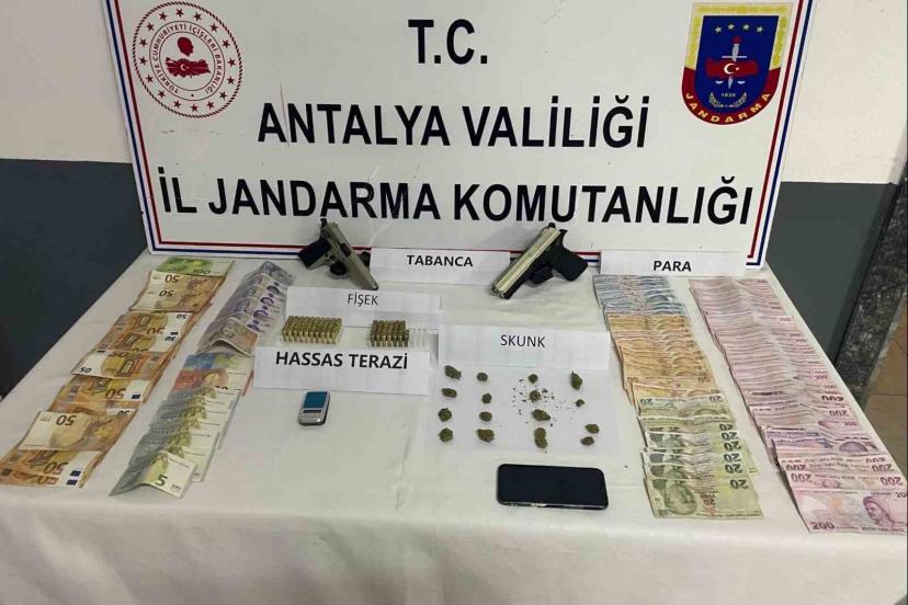 Yapılan aramalarda, 50 gram skunk, 1 hassas terazi, 2 ruhsatsız 9x19 milimetre tabanca, 82 adet 9x19 milimetre tabanca fişeği, 1 cep telefonu, bin 465 avro, 110 sterlin ve 14 bin 50 lira nakit para ele geçirildi.