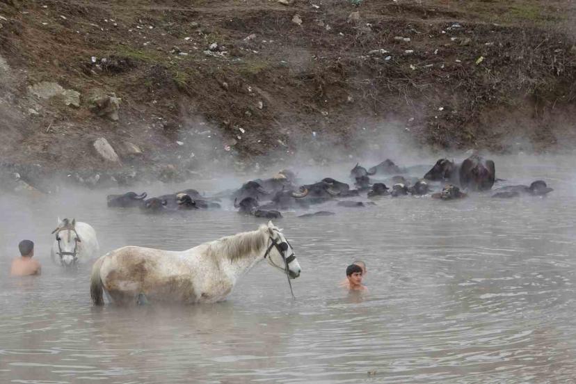 Sıcak su kaynaklarında yıkanan hayvanlar, özellikle fotoğraf tutkunlarının ilgi odağı haline geldi. Bölgedeki besiciler tarafından kaplıca alanına getirilen manda ve atlar, şifalı olduğu bilinen termal sularda temizleniyor. Soğuk havaya rağmen sıcak suyun içinde sakin bir şekilde bekleyen hayvanlar, buharın da etkisiyle etkileyici görüntüler oluşturuyor.