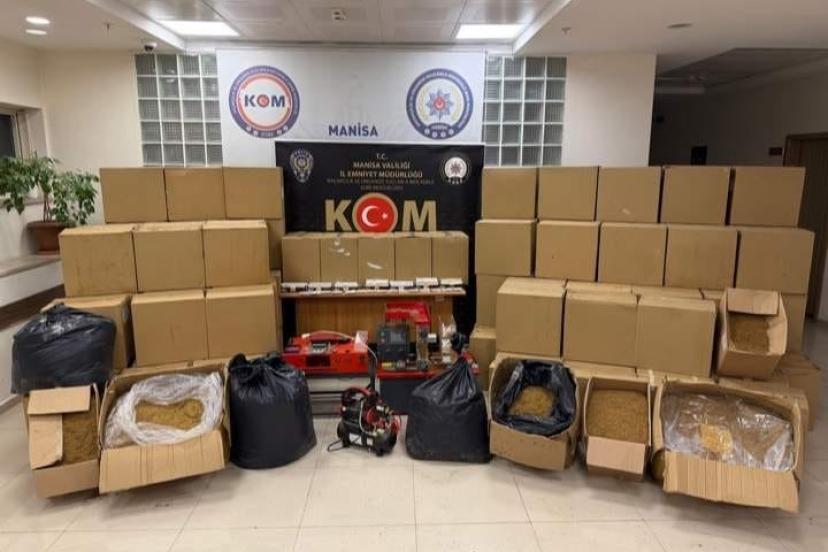 Manisa’da polis ekiplerince düzenlenen operasyonda 1 milyon bandrolsüz boş makaron, yüzlerce kilo kaçak tütün ve ruhsatsız silah ele geçirildi.