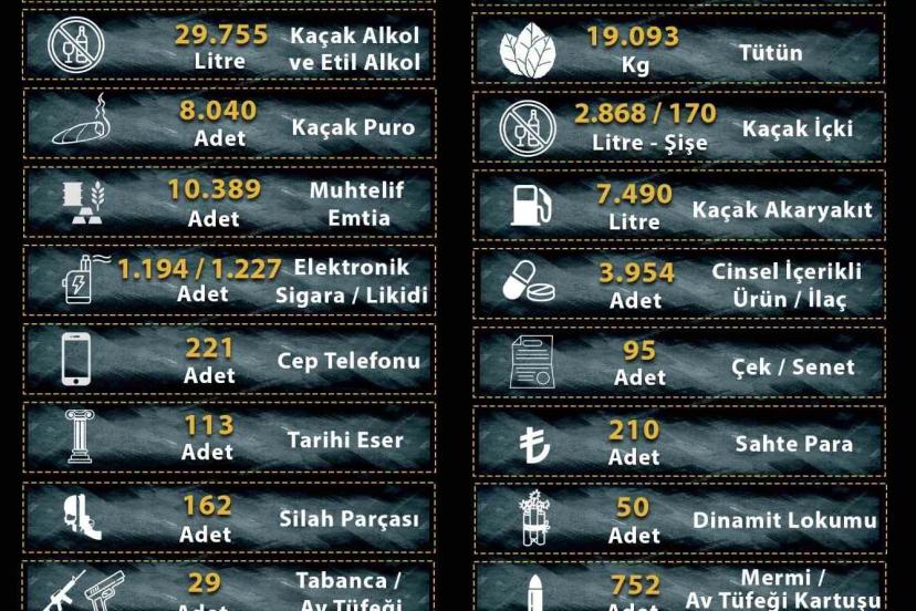 Operasyonlarda ele geçirilen suç unsurları ise kaçakçılığın boyutunu gözler önüne serdi. Yapılan aramalarda tütün mamullerinden tarihi eserlere, silahlardan sahte paraya kadar çok sayıda malzeme ele geçirildi. Ekiplerin 1 yıllık çalışmalarında; 24 milyon 801 bin 242 adet kaçak makaron, 34 bin 540 paket kaçak sigara, 19 bin 93 kilogram tütün ve nargile tütünü, 8 bin 40 adet puro, bin 194 adet elektronik sigara ve bin 227 adet likit ele geçirildi. Ayrıca sahte içki üretimine yönelik operasyonlarda; 29 bin 755 litre etil alkol, 2 bin 868 litre kaçak içki ve 170 şişe kaçak içkiye el konuldu. Aramalarda diğer suç unsurları ise şöyle sıralandı: 29 adet ruhsatsız tabanca ve av tüfeği, 162 silah parçası, 752 mermi, 50 adet dinamit lokumu, 113 adet tarihi eser, 221 kaçak cep telefonu, 3 bin 954 cinsel içerikli ürün, 7 bin 490 litre kaçak akaryakıt, 210 adet sahte para ile 95 adet çek ve senet. Manisa İl Emniyet Müdürlüğünden yapılan açıklamada, kaçakçılık suçları ve organize suç örgütleriyle mücadelenin kararlılıkla devam edeceği vurgulandı.