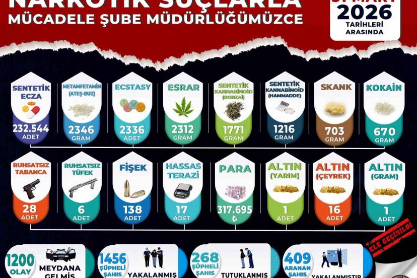 Aramalarda 232 bin 544 adet sentetik ecza hap, 2312 gram esrar, 2346 gram metamfetamin, 1216 gram sentetik kannabinoid hammaddesi, 1771 gram bonzai, 703 gram skunk, 670 gram kokain, 2 bin 336 adet extacy ele geçirildi. Ayrıca 28 ruhsatsız tabanca, 6 ruhsatsız tüfek, 138 fişek, 17 hassas terazi ile uyuşturucudan elde edildiği değerlendirilen 317 bin 695 TL, 16 çeyrek altın, 1 yarım altın ve 1 gram altına da el konuldu.