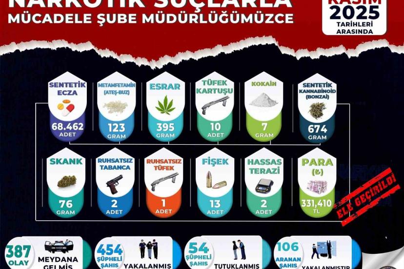 Manisa İl Emniyet Müdürlüğü Narkotik Suçlarla Mücadele Şube Müdürlüğü koordinesinde, Akhisar, Alaşehir, Salihli, Soma ve Turgutlu Narkotik Suçlarla Mücadele Büro Amirliklerinin desteğiyle 1-30 Kasım 2025 tarihleri arasında yürütülen çalışmalar sonucunda 387 olay meydana gelirken, 454 şüpheli yakalandı. Şüphelilerden 54’ü tutuklanırken, 106 aranan şahıs da yakalandı. Yapılan operasyonlarda; 68 bin 492 sentetik ecza (hap), 503 gram sentetik kannabinoid (bonzai), 395 gram esrar, 171 gram sentetik kannabinoid (bonzai) hammaddesi, 123 gram metamfetamin, 76 gram skank, 7 gram kokain, 2 ruhsatsız tabanca, 13 fişek, 1 ruhsatsız tüfek, 10 tüfek kartuşu, 2 hassas terazi ve uyuşturucu madde ticaretinden elde edildiği değerlendirilen 331 bin 410 TL para ele geçirildi.