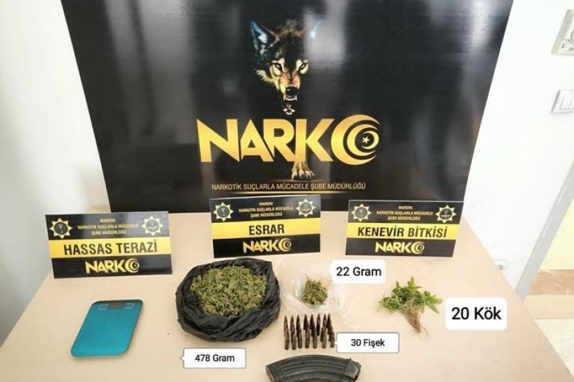 İl Emniyet Müdürlüğü Narkotik Suçlarla Mücadele Şube Müdürlüğü ekipleri, uyuşturucu madde ticareti ve kullanımının önlenmesine yönelik çalışma yürüttü. Bu kapsamda Artuklu ilçesinde bir araçta ve bir ikamette yapılan aramalarda 603 gram esrar, 20 kök hint keneviri, 30 adet kalaşnikof uzun namlulu silah fişeği, 1 adet kalaşnikof uzun namlulu silah şarjörü ile 1 adet hassas terazi ele geçirildi.
