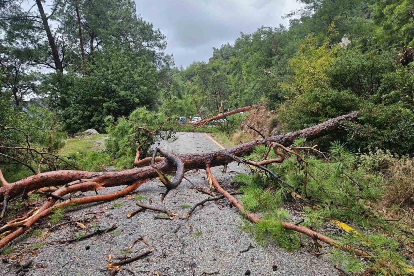Muğla’nın turistik Menteşe ilçesine bağlı Sarnıç Mahallesi Akbük Mevkii yolunda etkili olan şiddetli yağış ve fırtına, ulaşımı felç etti. Kuvvetli rüzgarın etkisiyle 3 büyük çam ağacı yola devrildi.