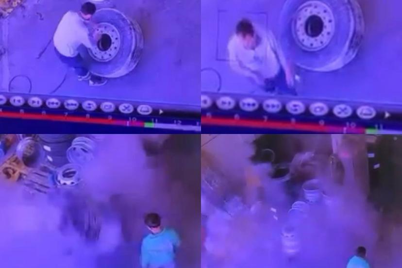 Olay anı ise güvenlik kamerasına yansıdı. Görüntülerde lastiği tamir etmeye çalışan Ali Doğan iğneyi almak için arkasını döndükten kısa süre sonra lastiğin bomba gibi patladığı anlar yer aldı.