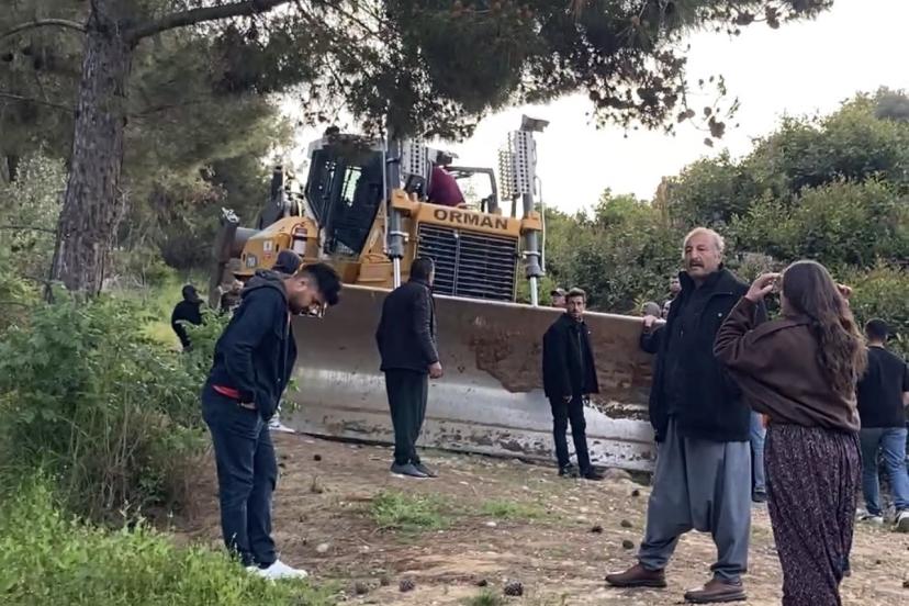 Mersin’de ormanlık alana oluşturulan narenciye bahçelerinin kaldırılması kararına tepki gösteren köylüler, iş makinelerinin ö...