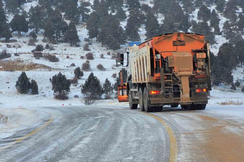 Mersin Büyükşehir Belediyesi ekipleri, Mut ilçesinin yüksek kesimlerinde etkili olan kar yağışı sonrasında kar küreme ve tuzlama çalışmaları yaparak kırsalda yolları açık tutmaya çalışıyor.