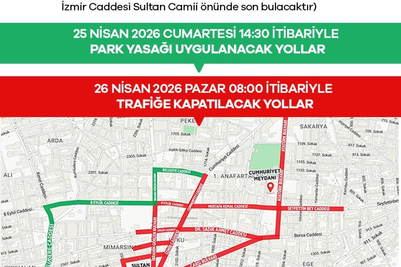Cumhuriyet Meydanı’na çıkan yollar ile birlikte, Atatürk Bulvarı üzeri (Cumhuriyet Caddesi ile Mustafa Kemal Paşa Caddesi arası), Sultan Camii önüne çıkan yollar, Valilik önüne çıkan yollar, Seyfettin Bey Caddesi üzeri (Kamilsu Caddesi ile Atatürk Bulvarı arası), Mustafa Kemal Paşa Caddesi üzeri (Atatürk Bulvarı ile Cumhuriyet Caddesi arası), 8 Eylül Caddesi üzeri (Cumhuriyet Caddesi ile İbrahim Gökçen Bulvarı arası), İzmir Caddesi üzeri (Mustafa Kemal Paşa Caddesi ile Murat Caddesi arası), 2507 Sokak üzeri (2500 Sokak ile İzmir Caddesi arası), 2505 Sokak üzeri (2501 Sokak ile İzmir Caddesi arası), Çarşı Bulvarı üzeri (İzmir Caddesi ile Dr. Sadık Ahmet Caddesi arası),Murat Caddesi üzeri (1800 Sokak ile İbrahim Gökçen Bulvarı arası), İbrahim Gökçen Bulvarı üzeri (8 Eylül Caddesi ile İzmir Caddesi arası) olan yollar trafiğe kapatılacak.