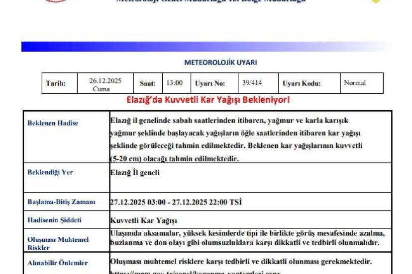Meteoroloji 13. Bölge Müdürlüğü’nden yapılan uyarıda, "Elazığ, Bingöl ve Tunceli genelinde sabah saatlerinden itibaren, yağmur ve karla karışık yağmur şeklinde başlayacak yağışların öğle saatlerinden itibaren kar yağışı şeklinde görüleceği tahmin edilmektedir. Beklenen kar yağışlarının kuvvetli (5-20 cm) olacağı tahmin edilmektedir. Ulaşımda aksamalar, yüksek kesimlerde tipi ile birlikte görüş mesafesinde azalma, buzlanma ve don olayı gibi olumsuzluklara karşı dikkatli ve tedbirli olunmalıdır" denildi.