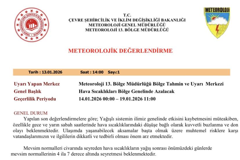 Meteoroloji 13. Bölge Müdürlüğü’nden yapılan uyarıda, "Yapılan son değerlendirmelere göre; yağışlı sistemin ilimiz genelinde etkisini kaybetmesini müteakiben, özellikle gece ve yarın sabah saatlerinde hava sıcaklıklarındaki düşüşe bağlı olarak kuvvetli buzlanma ve don olayı beklenmektedir. Ulaşımda yaşanabilecek aksamalar başta olmak üzere muhtemel risklere karşı vatandaşlarımızın ve ilgililerin dikkatli ve tedbirli olması önem arz etmektedir. Mevsim normalleri civarında seyreden hava sıcaklıkların yağış sonrası önümüzdeki günlerde mevsim normallerinin 4 ila 7 derece altında seyretmesi beklenmektedir" denildi.
