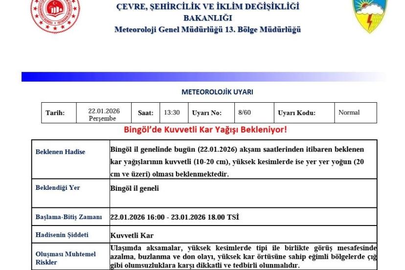 Meteoroloji 13. Bölge Müdürlüğü tarafından yapılan açıklamada, "Bingöl il genelinde bugün (22.01.2026) akşam saatlerinden itibaren beklenen kar yağışlarının kuvvetli (10-20 cm), yüksek kesimlerde ise yer yer yoğun (20 cm ve üzeri) olması ve yağışın 23.01.2026 saat 18.00’a kadar süreceği beklenmektedir. Ulaşımda aksamalar, yüksek kesimlerde tipi ile birlikte görüş mesafesinde azalma, buzlanma ve don olayı, yüksek kar örtüsüne sahip eğimli bölgelerde çığ gibi olumsuzluklara karşı dikkatli ve tedbirli olunmalıdır" ifadelerine yer verildi.