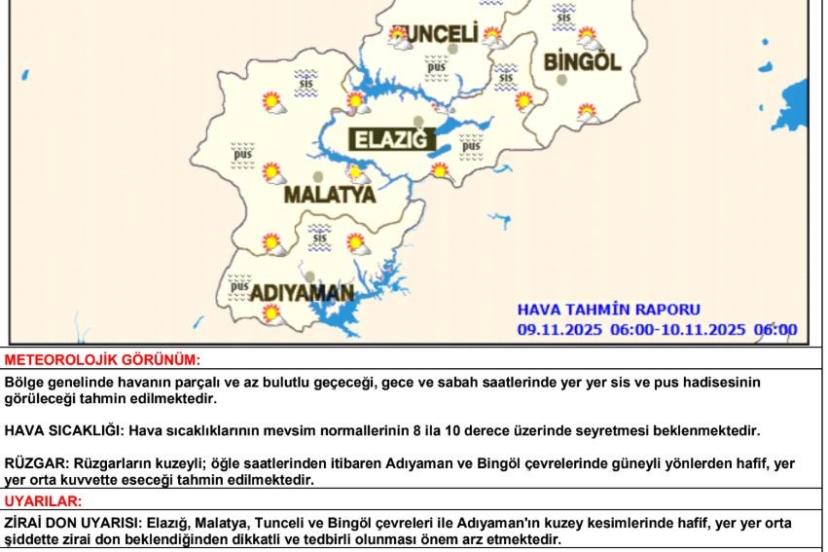 Meteoroloji 13. Bölge Müdürlüğü’nden yapılan açıklamada, "Elazığ, Malatya, Tunceli ve Bingöl çevreleri ile Adıyaman’ın kuzey kesimlerinde hafif, yer yer orta şiddette zirai don beklendiğinden dikkatli ve tedbirli olunması önem arz etmektedir. Bölge genelinde toz taşınımı beklendiğinden meydana gelebilecek görüş mesafesinde düşme, ulaşımda aksamalar, hava kalitesinde azalma gibi olumsuzluklara karşı dikkatli ve tedbirli olunması önem arz etmektedir" denildi.