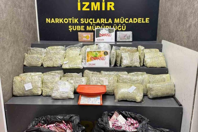 İzmir Narkotik Suçlarla Mücadele Şube Müdürlüğü, Asayiş Şube Müdürlüğü ve Konak İlçe Emniyet Müdürlüğü ekipleri savcılık koordinesinde Konak ilçesindeki metruk bir binada uyuşturucu bulunduğu bilgisi üzerine harekete geçti. Adrese düzenlenen operasyonda yapılan aramada 28 kilo 240 gram esrar-skunk, 2 kilo 166 gram kokain ve 29 bin 350 adet sentetik ecza bulundu. Operasyon kapsamında 2 şüpheli gözaltına alındı. Emniyetteki işlemlerinin ardından şüpheliler adli makamlara sevk edildi.