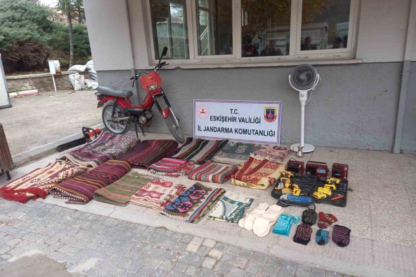 Eskişehir Günyüzü ilçesinde 04 Aralık tarihinden itibaren meydana gelen 20 evden hırsızlık olayının aydınlatılması maksadıyla Eskişehir İl Jandarma Komutanlığı JASAT Dedektif Timleri tarafından çalışma yapıldı. Yapılan çalışma neticesinde; olayları mahallede kendilerini mezar ustası olarak tanıtan 2 şüphelinin gerçekleştirdiği, çaldıkları malzemeleri Konya ve Ankara illerinde sattıkları tespit edildi. Şüphelilerin yakalanması ve çalınan malzemelerin ele geçirilmesi maksadıyla 10 Aralık tarihinde Konya ve Ankara illerinde 3 ikamet, 2 iş yeri ile 2 araçta icra edilen eş zamanlı operasyon sonucunda 2 şüpheli yakalanarak gözaltına alındı. Çalışmalarda çalınan malzemenin tamamı jandarma tarafından ele geçirildi. Çalınan malzemeler arasında; el emeği patik, testere, halı, matkap, çapa motoru ve vantilatör gibi malzemeler ise ‘pes’ dedirtti. Şüpheli şahıslar hakkında soruşturma başlatıldı.