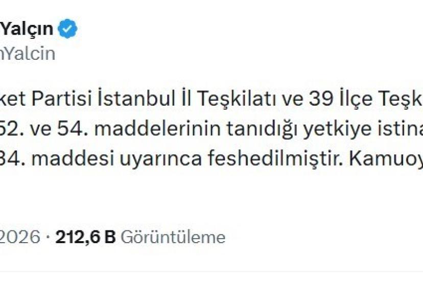 "Milliyetçi Hareket Partisi İstanbul İl Teşkilatı ve 39 İlçe Teşkilatı, parti tüzüğümüzün 52. ve 54. maddelerinin tanıdığı yetkiye istinaden, yine tüzüğümüzün 34. maddesi uyarınca feshedilmiştir. Kamuoyuna saygıyla duyurulur."