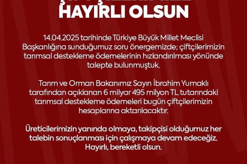 Ersoy paylaşımında şu ifadelere yer verdi; "Çiftçilerimize hayırlı olsun. 14.04.2025 tarihinde Türkiye Büyük Millet Meclisi Başkanlığına sunduğumuz soru önergemizde; çiftçilerimizin tarımsal destekleme ödemelerinin hızlandırılması yönünde talepte bulunmuştuk. Tarım ve Orman Bakanımız Sayın İbrahim Yumaklı tarafından açıklanan 6 milyar 495 milyon TL tutarındaki tarımsal destekleme ödemeleri bugün çiftçilerimizin hesaplarına aktarılacaktır. Üreticilerimizin yanında olmaya, takipçisi olduğumuz her talebin sonuçlanması için çalışmaya devam edeceğiz. Hayırlı, bereketli olsun."