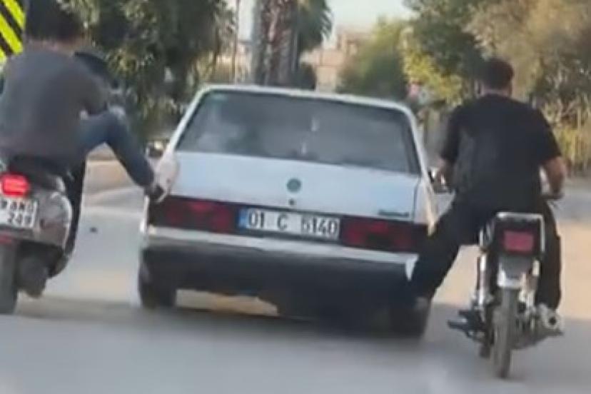 Dikkatleri çeken olay, merkez Seyhan ilçesine bağlı Akkapı Mahallesi’nde yaşandı. Tofaş Şahin marka otomobil henüz bilinmeyen bir nedenle yolda kaldı. Sürücünün yardımına motosikletliler yetişti. Motosikletliler, aracı ayaklarıyla ittirdi.