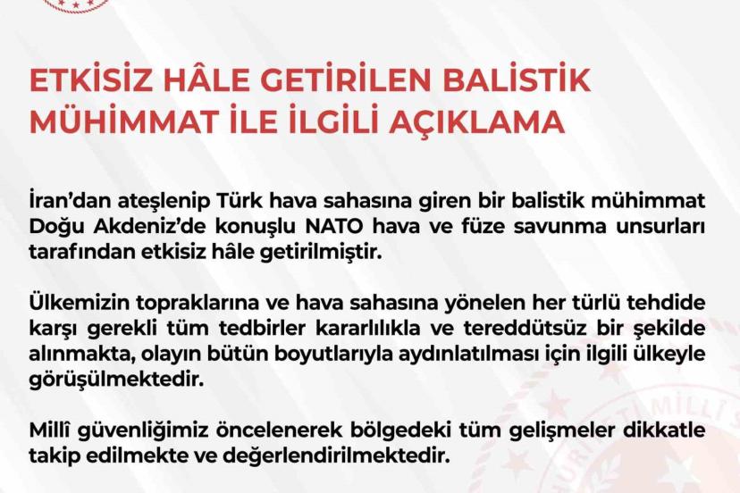 "İran’dan ateşlenip Türk hava sahasına giren bir balistik mühimmat Doğu Akdeniz’de konuşlu NATO hava ve füze savunma unsurları tarafından etkisiz hale getirilmiştir. Ülkemizin topraklarına ve hava sahasına yönelen her türlü tehdide karşı gerekli tüm tedbirler kararlılıkla ve tereddütsüz bir şekilde alınmakta, olayın bütün boyutlarıyla aydınlatılması için ilgili ülkeyle görüşülmektedir. Milli güvenliğimiz öncelenerek bölgedeki tüm gelişmeler dikkatle takip edilmekte ve değerlendirilmektedir. Kamuoyuna saygıyla duyurulur."