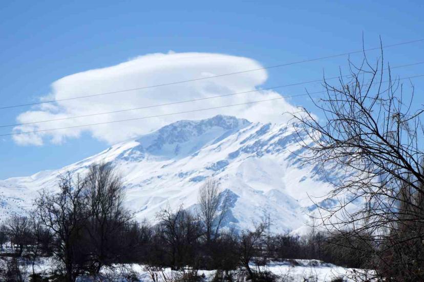 Geniş bir alana yayılan bu büyük bulut, dağın karlı manzarasıyla muazzam bir uyum içinde birleşerek büyüleyici bir görüntü oluşturdu.