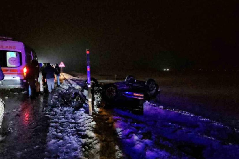 Muş-Erzurum karayolunda karla karışık yağmur nedeniyle kayganlaşan yolda kontrolden çıkan otomobil takla atarak şarampole yuvarlandı.