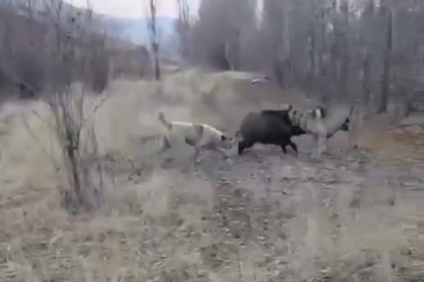 Muş’un Korkut ilçesine bağlı Karakale köyünde tarlaya inen yaban domuzu, çoban köpeklerinin saldırısına uğradı. O anlar cep telefonu kamerasıyla kaydedildi.
