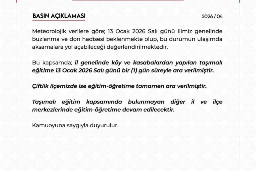 Yapılan basın açıklamasında, 13 Ocak 2026 Salı günü Niğde genelinde buzlanma ve don hadisesinin etkili olmasının beklendiği, bu durumun özellikle ulaşımda aksamalara yol açabileceği belirtildi. Öğrencilerin güvenliğini sağlamak amacıyla il genelinde köy ve kasabalardan yapılan taşımalı eğitime bir gün süreyle ara verildiği bildirildi.